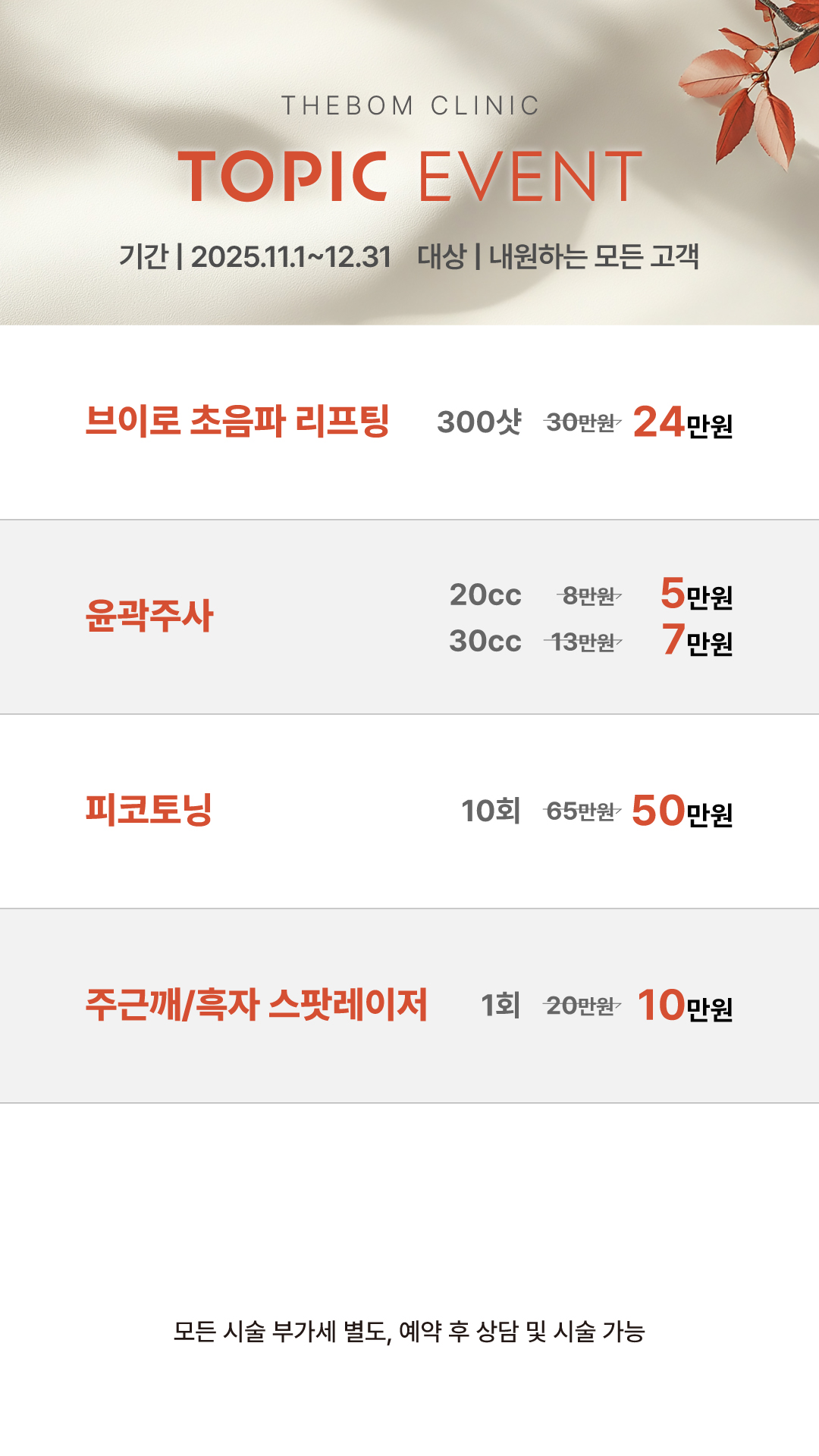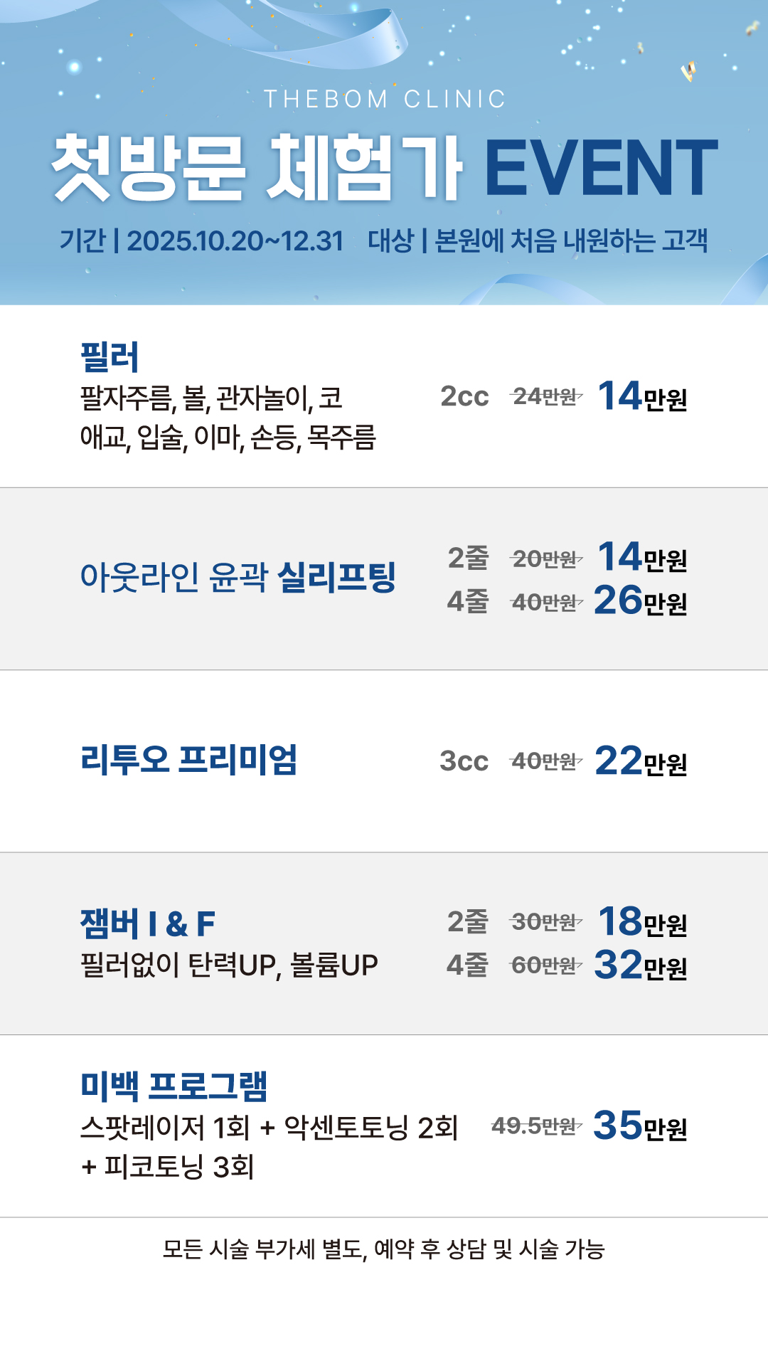 더봄은 풍부한 임상 경험과 오랜 시간의 연구를 통한 시술로 최고의 예후를 제공하기 위해 노력합니다. 그 처음은 면밀한 상담을 통한 고객에 대한 깊은 이해로부터 출발합니다. 더불어 정밀하게 진단하고 필요한 시술만을 정확하게 판단하여 고객에게 건강한 아름다움을 선사하고자 합니다. 또한, 정품 시술, 정량 사용을 원칙으로 고객에게 정직하게 다가가겠습니다.